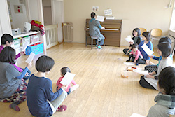 メロディーに誘われて「なになに?」と子どもも参戦。一緒にリズムをとり、飽きたら隣の部屋で遊びます。