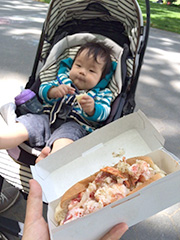 身長は3cm伸びてるけど、体重が2ヶ月前から140gしか増えず。前回、日本で受けた健診でも増加がにぶかったので、これは問題だと。さらに、おすわりはまだ手をついてるし、アメリカ式のチェック項目で「つかまり立ちするか」「伝い歩きするか」「“ちょうだい”できるか」「バイバイできるか」といった項目が、ほぼ、全滅!