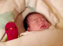 だんだんと体がしっかりして、声が大きくなっていくのが目に見える成長です。自分の泣き声、やまちゃんの声など、音のする場所を聞き分けながら、脳のシナプスがどんどん発達していきます。あたたかい家族に囲まれて、しーくんは幸せそう!!