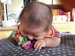 昨日、夫が息子に指をガジガジされた時に「歯の存在を感じる」と言ってましたが、今日私がかじられたら歯ぐきから頭が出てました。色々かじりたいみたいだけど、まだ指がうまく使えなくて自分の指ばかりしゃぶってます。