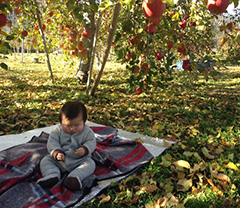緑と見事な実りに囲まれているしーくんを見ながら、頭にりんごが落ちてこないかと心配で心配で…。