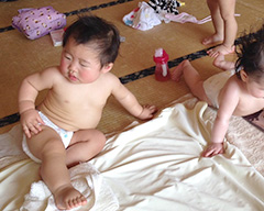 なんとおばあちゃんズが助けに来てくれたので、離れられる子は和室で遊んでもらいました。時々泣いて調理室までお呼びがかかる子もいましたが、うちの息子はずっと和室。最近オンブすると暴れて腕を出し、脱出しそうになるので重心フラフラで大変なのです。本当に助かりました。