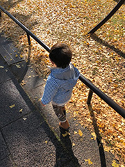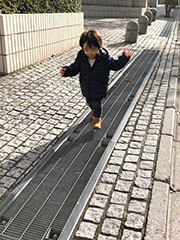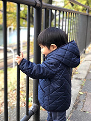 11月26日(日) 遠回り散歩 午後から旦那さんと私、ベビーけいちゃんの3人で散歩へ。東西線が大好きなベビーけいちゃんのために旦那さんが考えた今日の散歩コースは、東西線で飯田橋へ。線路沿いを散歩して帰りは総武線に乗り換えて帰ってくるというもの。実は真の目的地は家から歩いて15分程のスーパーで、ベビーけいちゃんが好きなオヤツを買うためなのだけど、そこに向かうために電車でグルっと遠回りする計画らしい。排水溝のアルミメッシュの蓋や段差解消ステップ、落ち葉、自販機のお釣りの出るところ、坂道、階段、ベビーけいちゃんの気になるものがいっぱいでなかなか進まず…。「とーざいしぇっ!(東西線)」と呪文のように繰り返しながら歩くベビーけいちゃん、よっぽど好きね~。 大人なら1時間の道のりを、途中休憩もはさみつつ5時間近くかかって帰宅。たくさん歩いたね!