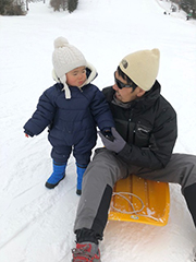 これ、私も長男コロの時に経験済み。子供を乗せたソリを引っ張ってゲレンデを登るのはなかなかの重労働で、さらに地味に辛いのがソリで一緒に座って滑る時に自分の足を上げ続けて(腹筋と太ももに負荷)いること。そして終わりがみえないこと。「もう一回!」と永遠に言われるツラさ。旦那さん、本当にお疲れ様。