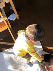 最初は寒くて気乗りしなかったのに、一度滑ったら楽しすぎてまだまだ滑りたいくらいだった。気持ちよく滑り降りてきたら、ゲレンデの下でソリに座ってうなだれている旦那さんを発見。聞いたらベビーけいちゃんがソリの楽しさにハマり、ひたすら登っては滑るを繰り返していたらしく体力の限界に達したらしい。その横でまだソリで遊びたそうなベビーけいちゃんが、「あ!あ!」と旦那さんに話しかけていた。