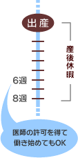 働くママの職場環境はさまざまです。出産休暇には産前休暇と産後休暇がありますが、産後休暇は出産と同時に8週間とることができます。もっと早く復帰したい場合には、産後6週間以後に医師の許可を得て復帰することになります。育児休業をとらずに、産休明けと同時に仕事を再開するママの場合は、通勤や勤務時間に合わせて、生活リズムを整えていきましょう。