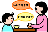 食事の前には「いただきます」、後には「ごちそうさま」などのあいさつもできるようになってきます。でも、どんなあいさつも周囲の大人のリードがあって初めてできます。「子は親の鏡」といいますね。ママや周りの大人は、「いただきます」「ごちそうさま」と実際に声に出して、態度で表してお手本を示しましょう。