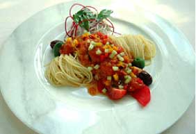 2 フライパンにオリーブオイル大さじ1を入れ、弱火でニンニクのみじん切りを炒め、きつね色になったら、(1)のトマトを入れ、10分ほど煮こんで、塩・コショウで味を整える。これを温かいパスタにからめて温製でもOK。冷製の場合は、塩・コショウを強めにして、冷蔵庫で冷やしておく。 |