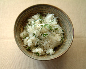 何年か前の、朝の連続テレビ小説の「ふたりっこ」で桂枝雀が演じる師匠が「じゃこめし」好きだった。それがどんなものかわからないけれど、じゃこの塩味と青じそのさわやかな風味がいいのだ。混ぜるだけなので、お昼ごはんによく作る。