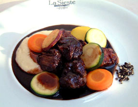 | 1 牛肉は4cm角に切り、赤ワイン、適当な大きさに切った玉ネギ、ニンジン、ローリエ、ニンニクの中に1昼夜漬け込む。