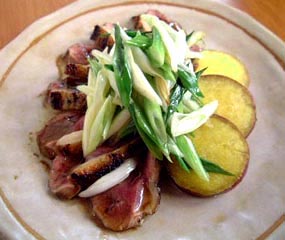 | 8 鴨肉はスライス、サツマイモ、細ネギを盛り、バルサミコ、オリーブオイルをさっとかけて、イタリアンパセリを散らす。