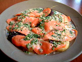 | 3 2のポテトとシイタケを皿に平らに並べ、熱いうちにサーモンのスライスをのせる。その表面をバーナーで焼くか、または180度のオーブンで1、2分。サーモンの表面が白っぽく、中はまだ生、という状態がベスト。