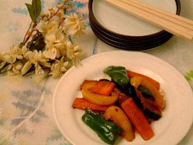 付け合わせとして思いついた1品ですが、私自身が好物なので、オススメします。大人用なら赤青黄ピーマンとナスで作ると本当にキレイです。