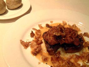 | 7 豚肩肉とはまぐりのコロッケを皿に盛り、4のソースをかけ、セロリラヴのピューレとチップを散らして、出来上がり。