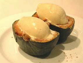 | ねっとり、ほっくりしたカボチャの温かい甘味とアイスクリームの冷たい甘味のコンビネーション。パーティなら、大きなカボチャを使って。アイスクリームは各自で取り分けて食べると、いいですね。