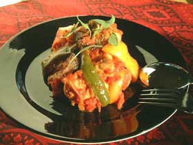 トマトの赤やピーマンが色鮮やかですので、黒いお皿に盛ると一層映えます。