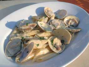 | 2 鍋にオリーブオイルを入れ、ニンニクを炒め、ハマグリを入れて、白ワインを注ぎ、フタをする。