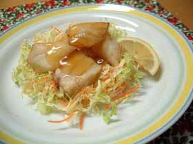 たんぱくな味のタラは揚げ物に向いています。空揚げは衣が少ないので、カロリ−は思ったよりも低いんですよ。野菜も添えて、ヘルシーに。
