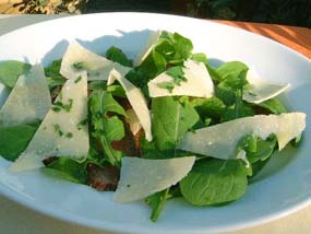 | 3 モモ肉をカットし、ルーコラ、パルミジャーノ・レッジャーノを盛り、バージンオイルを回しかける。塩、コショウは好みで。