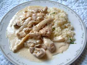 鶏肉は家でよく使うアイテムです。中でもこの煮込みは、鶏肉のおいしさが引き立つ一品。これもマダムに教えてもらいました。一見、ちょっとしつこそうに見えますが、茸を使ったり、レモンをキュッと絞ったりしているので、意外にヘルシーです。バターライスを少し添えるのが、フランス風。