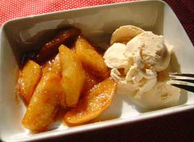 ホームステイしている間、毎日の手作りデザートが楽しみでした。シンプルで簡単なものでしたが、美味しかったです。フルーツを使った物も多く、とくにリンゴはいろいろ種類がありました。今回はただソテーするだけ。アイスクリ−ムを置いた時、キヤラメルが、「パリッ!」として、おいしいですよ。